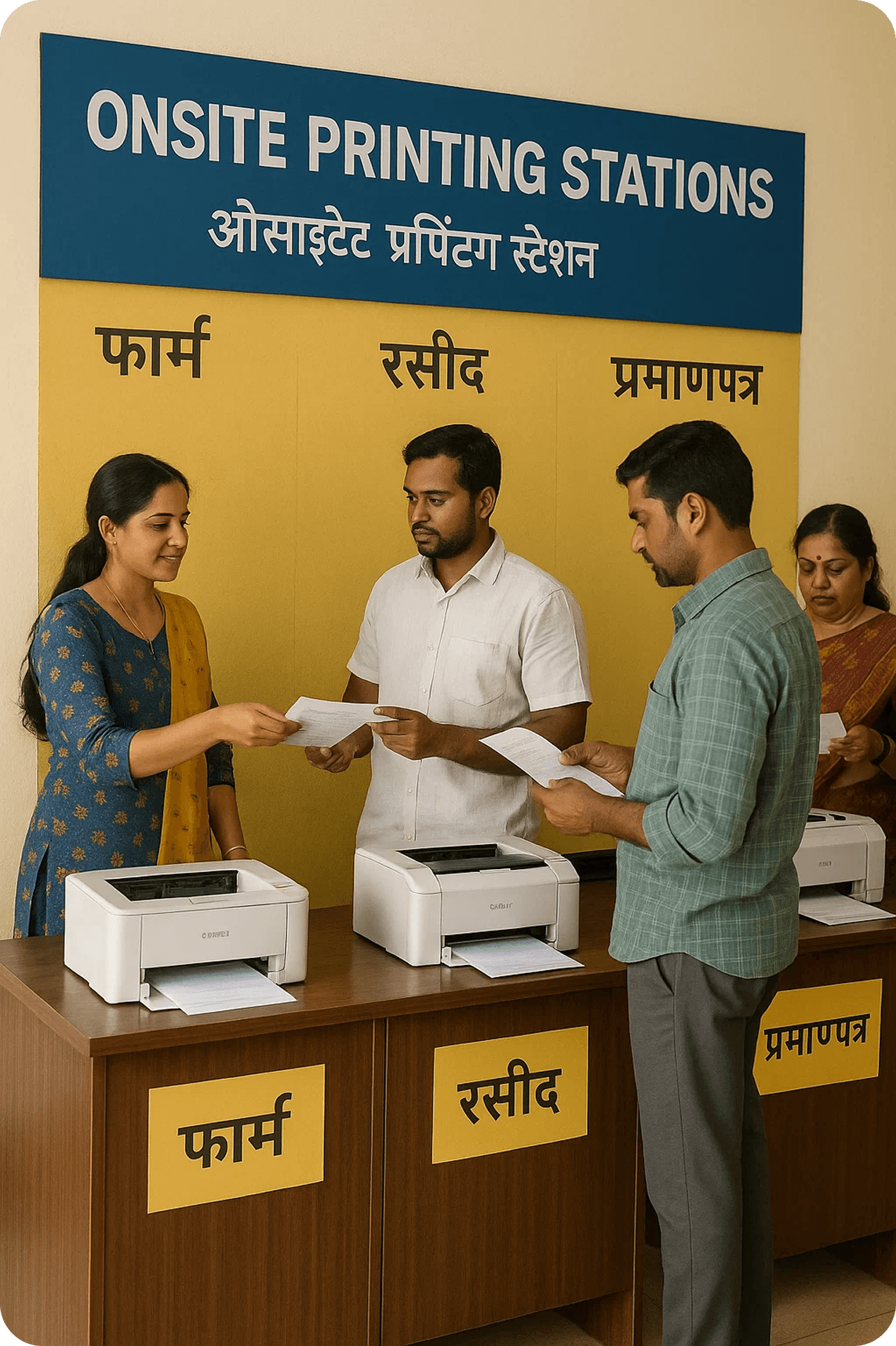 → Dedicated counters for immediate printing of forms, receipts, and certificates to help users without digital access or printers at home.