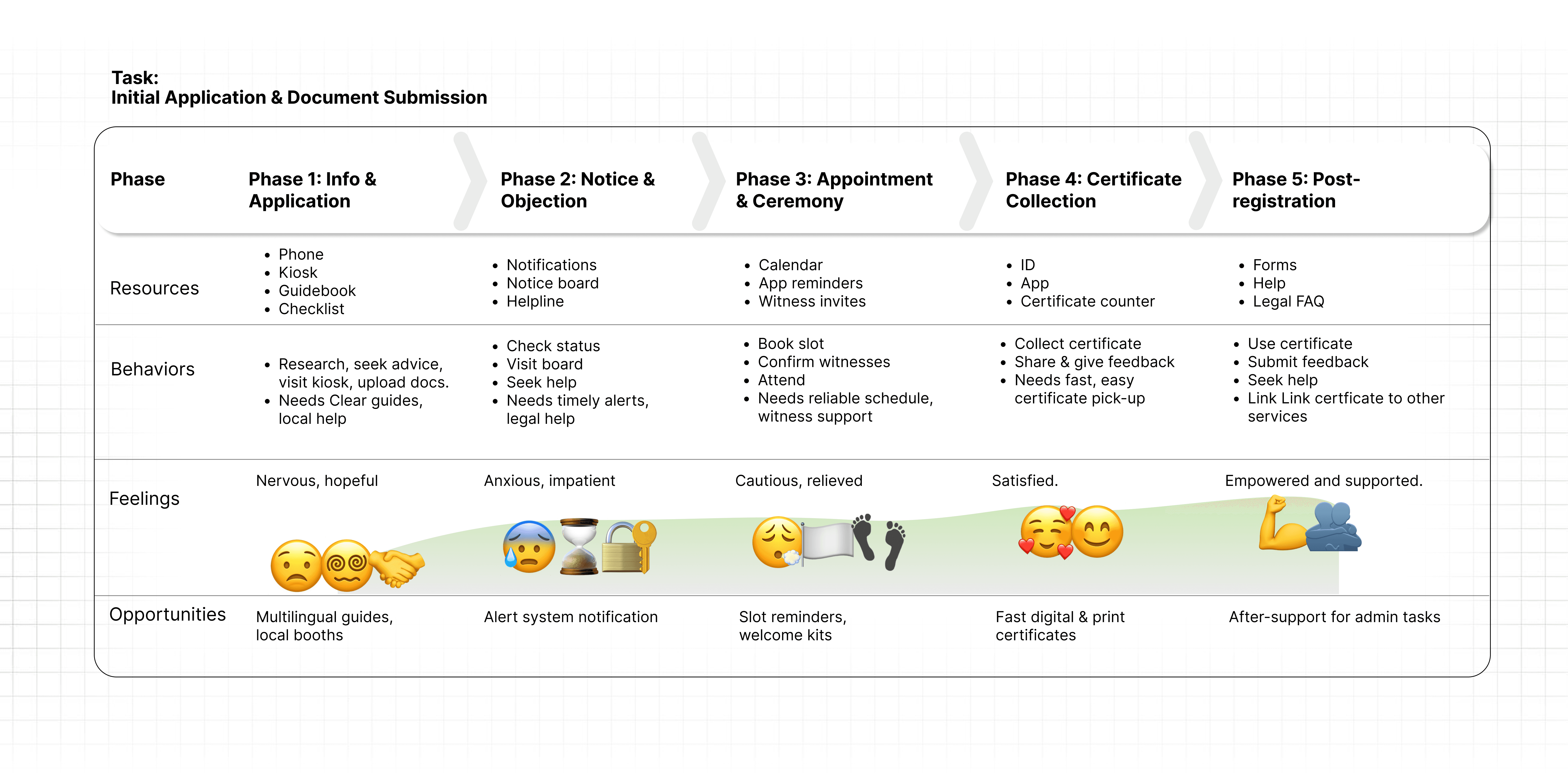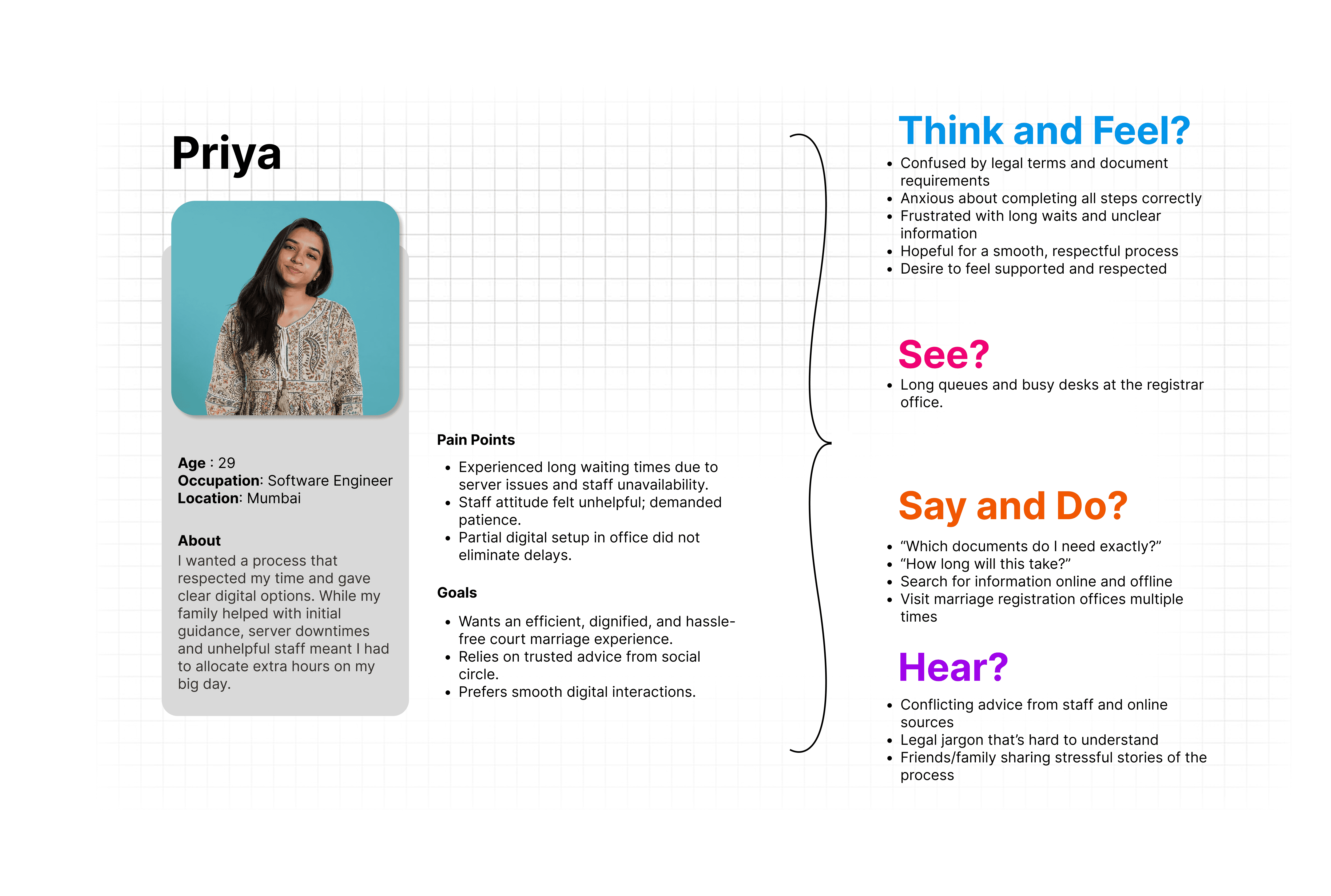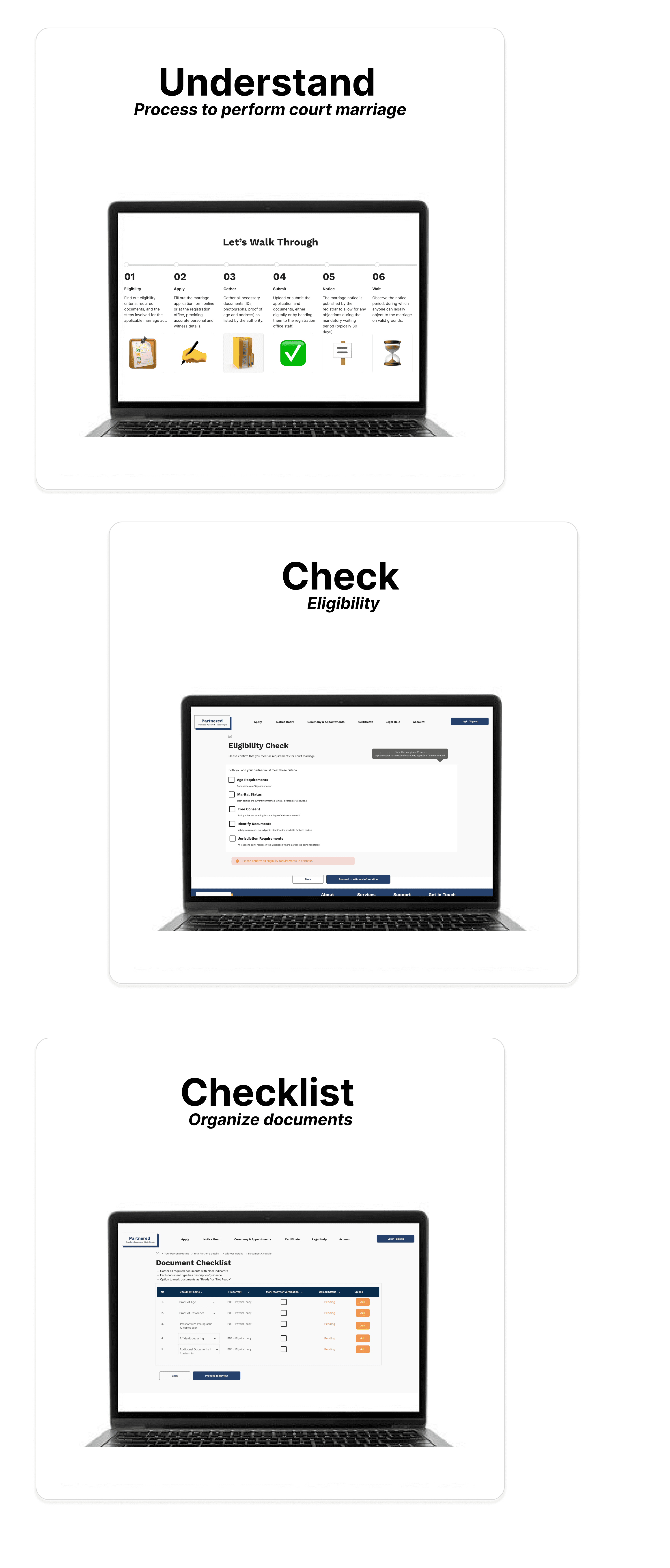 Design a phygital (physical + digital) platform that transforms the court marriage process in India into an accessible, error-proof, and privacy-respecting journey. The service simplifies documentation, enables status tracking, and integrates supportive physical touchpoints such as printed guides, consultation kiosks, and on-site document assistance, ensuring couples experience both digital convenience and the reassurance of human guidance.