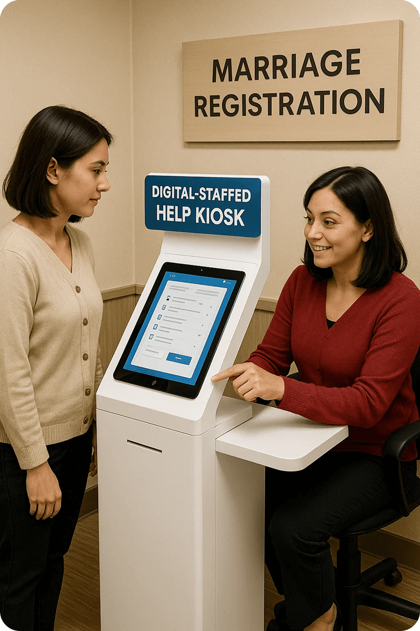 → Placed in marriage registration offices, these kiosks allow users (especially those less comfortable with technology) to get assisted help for filling forms, uploading documents, and tracking applications using a tablet or touchscreen device with staff support nearby.