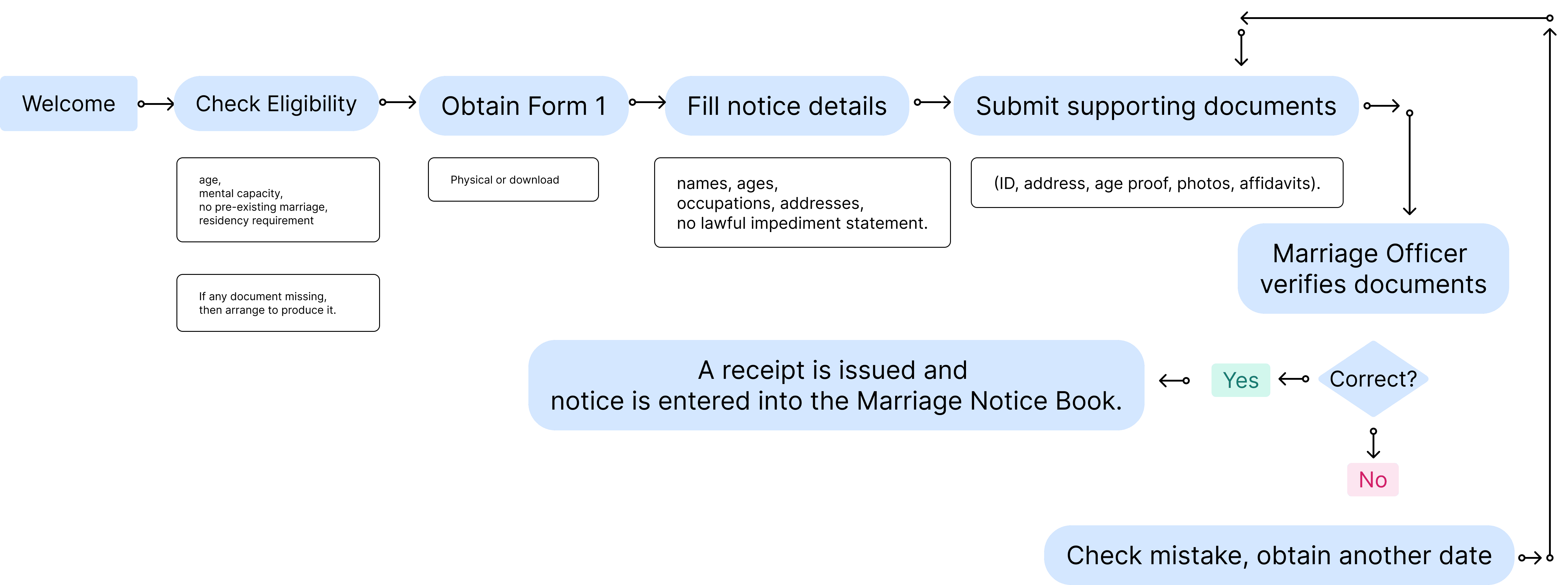 → Distribute easy-to-understand printed booklets that explain marriage eligibility, document requirements, and the timeline to offline users visiting offices.